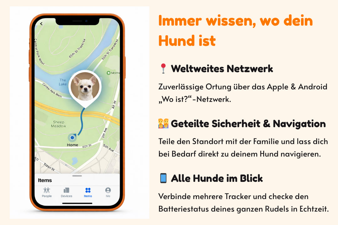 Sichere dir maximale Sicherheit für deinen Hund – ganz ohne Abo-Falle! Der Emmalove Urban Locator ist die smarte Alternative zu teuren GPS-Geräten. Mit nur 22g ist er federleicht und stört deinen Vierbeiner nicht im Alltag. Er nutzt das weltweite Apple und Android "Wo ist?"-Netzwerk, um dir jederzeit den genauen Standort deines Hundes auf dein Smartphone zu senden. Dank der wechselbaren Batterie hast du ein ganzes Jahr lang Ruhe vor dem Ladekabel. Hinweis: Dieser Artikel enthält ausschließlich den Tracker. Ein Halsband oder eine Halterung sind nicht im Lieferumfang enthalten.